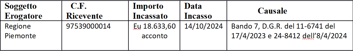 In ottemperanza all’obbligo di trasparenza, si riportano i contributi economici ricevuti dalle PA nell’anno precedente